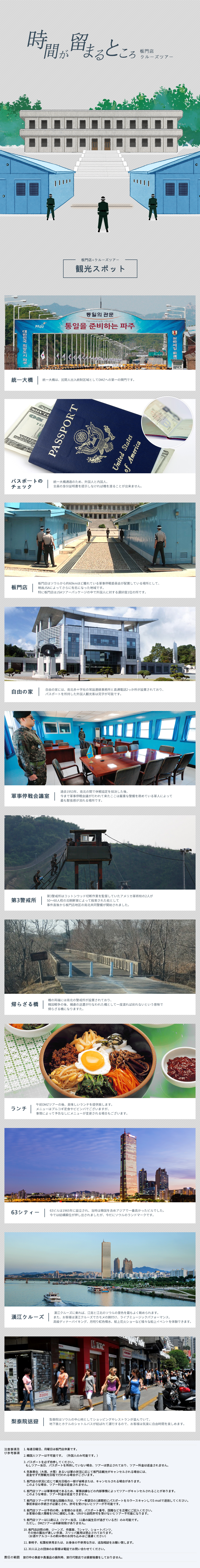 プレジデントホテル - 統一大橋 -パスポート及び身分証明書のチェック - 板門店 - 自由の家 - 軍事停戦会議室 - 第3警備所の展望台 - 帰らざる橋 - ランチ - プレジデントホテル/明洞(ミョンドン)ロッテホテル - 漢江(ハンガン)クルーズツアー - 63ビル展望台 - 梨泰院(イテウォン)送迎